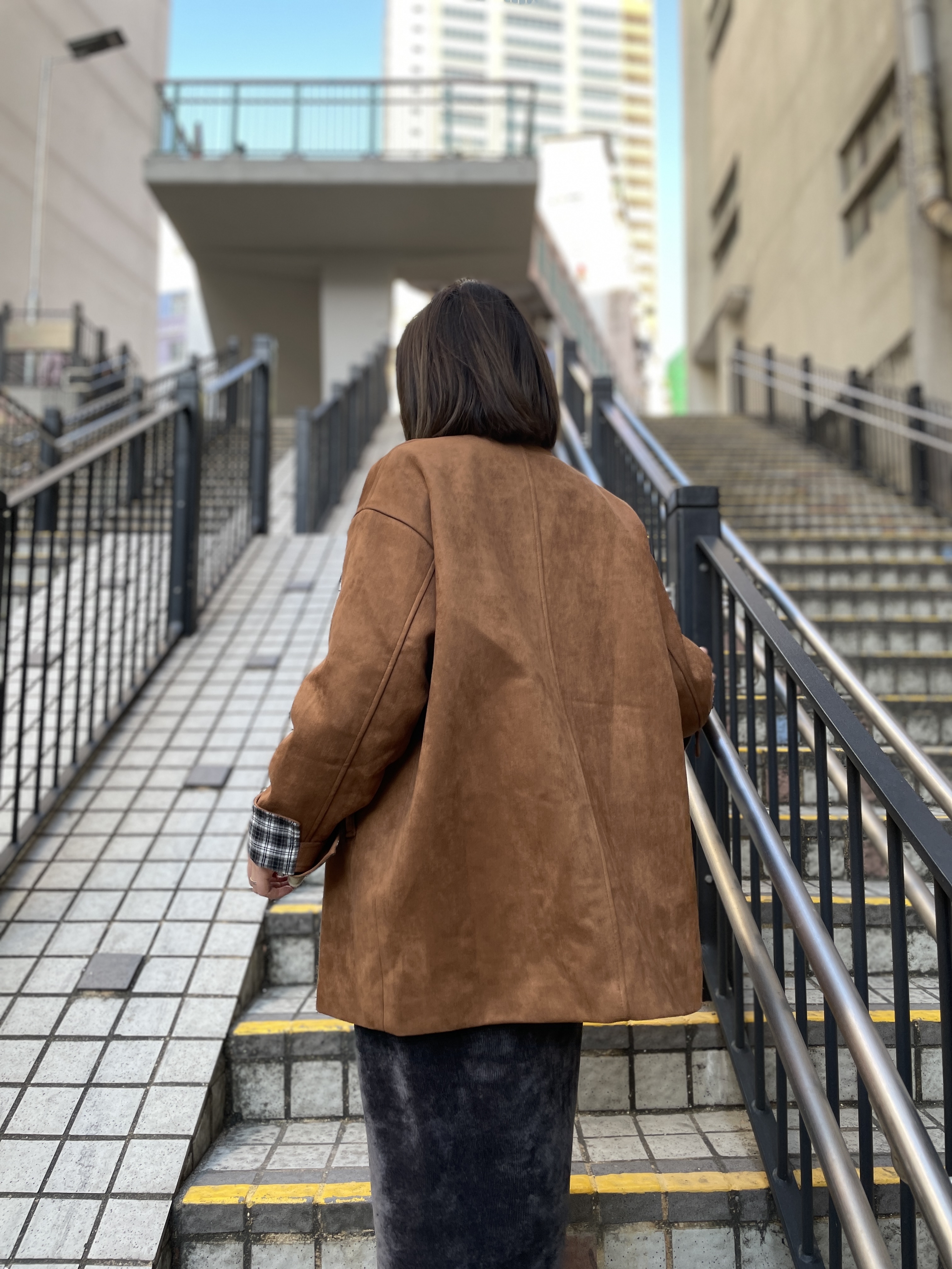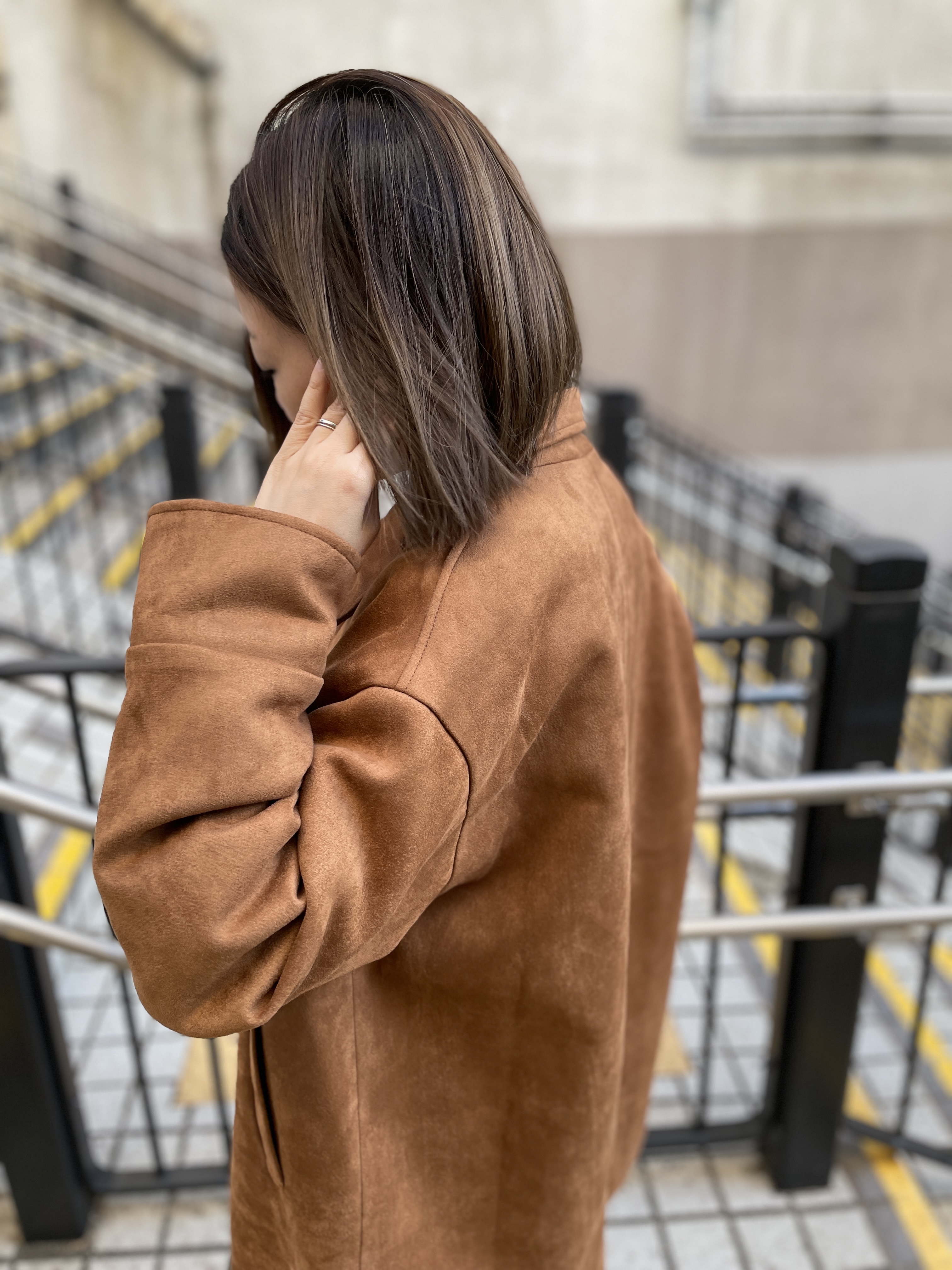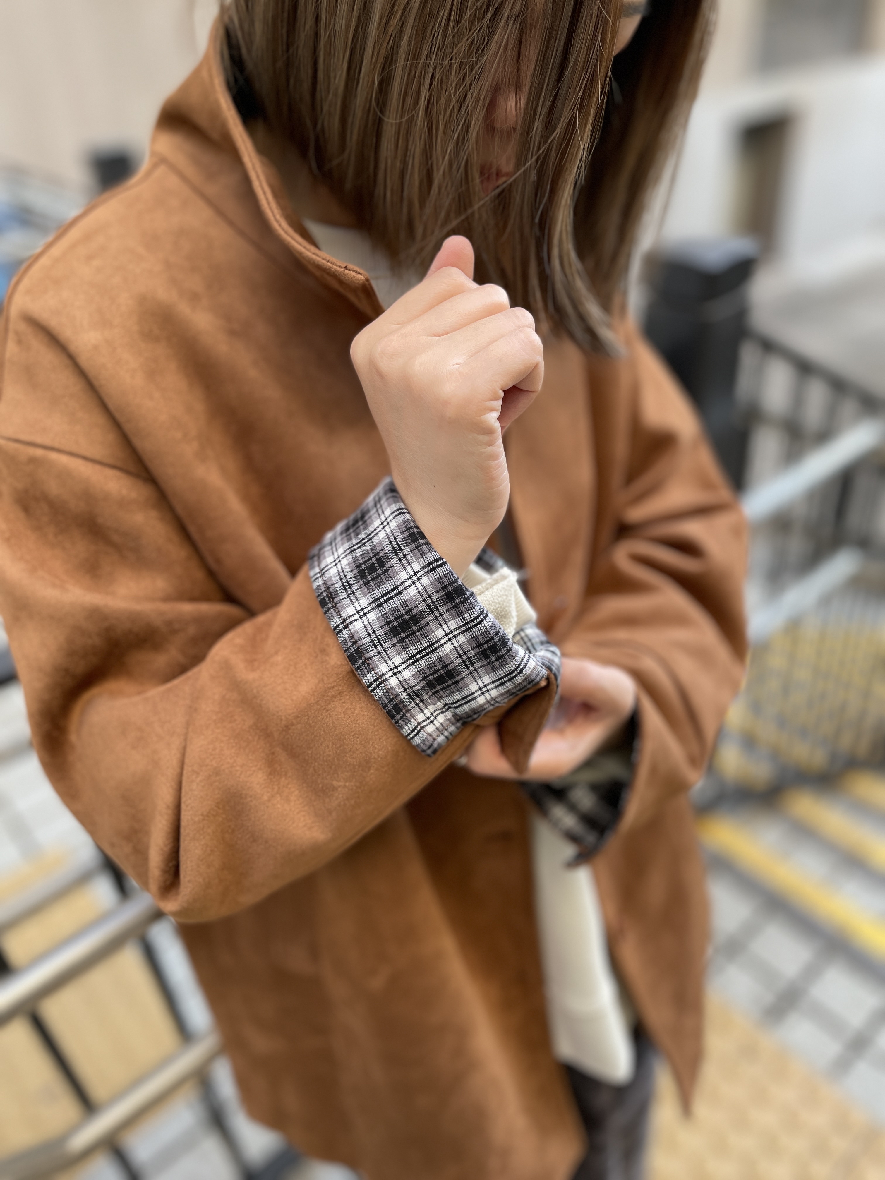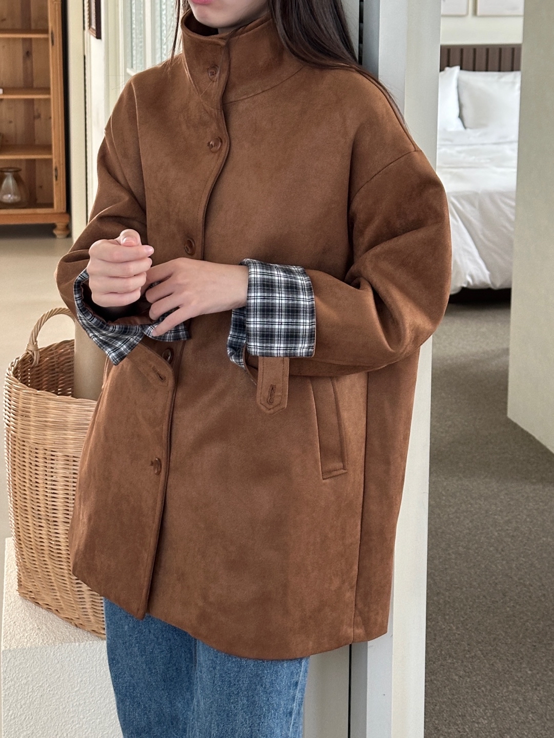 呢個仿麂皮料都幾像真,最重要係唔重身。 中長係今天秋冬好興的長度,蓋到pat pat位唔顯肥。 企領著更見硬朗。袖口反出來外露出格仔布,唔鐘意都可以唔反袖著。啡色比黑色會更突出麂皮質感。 📏尺寸:Free Size 胸圍: 48" 身長: 29.5"