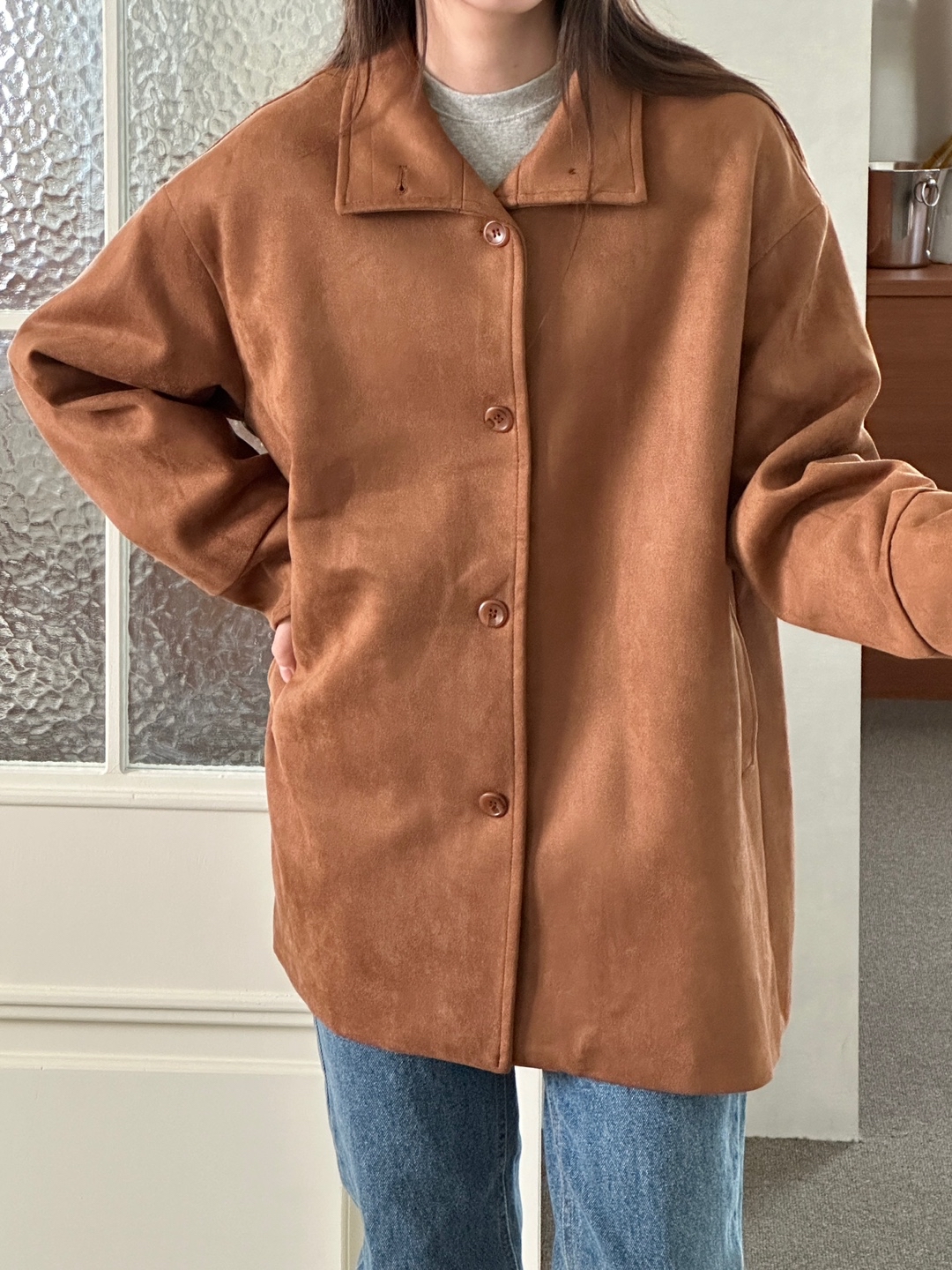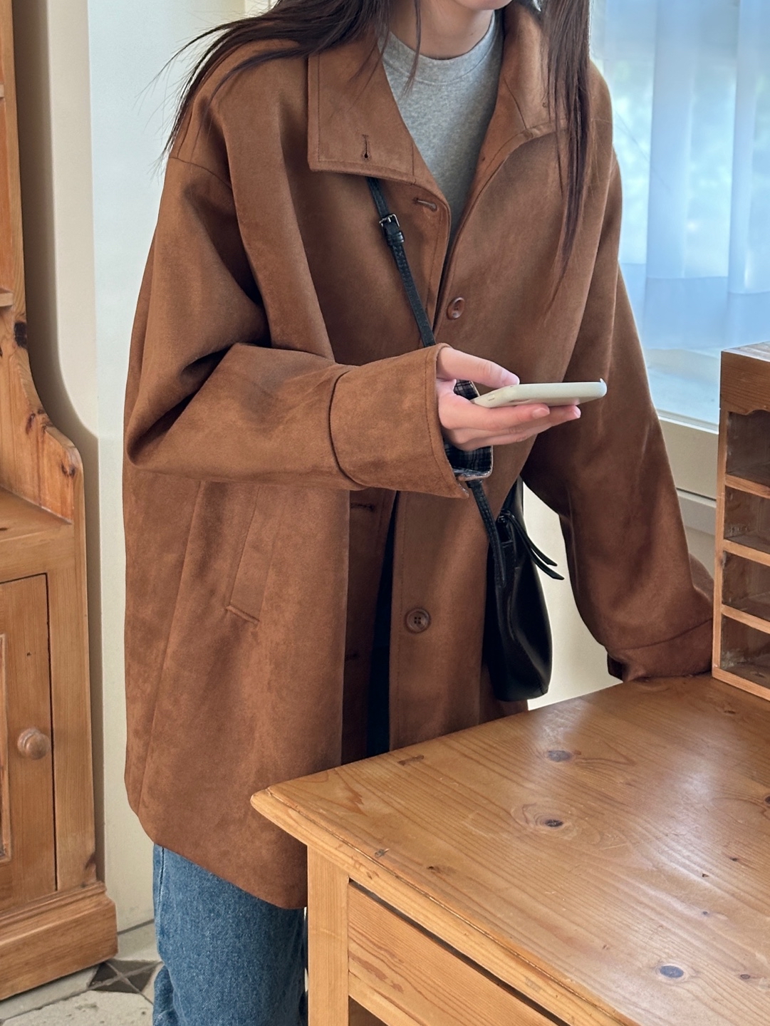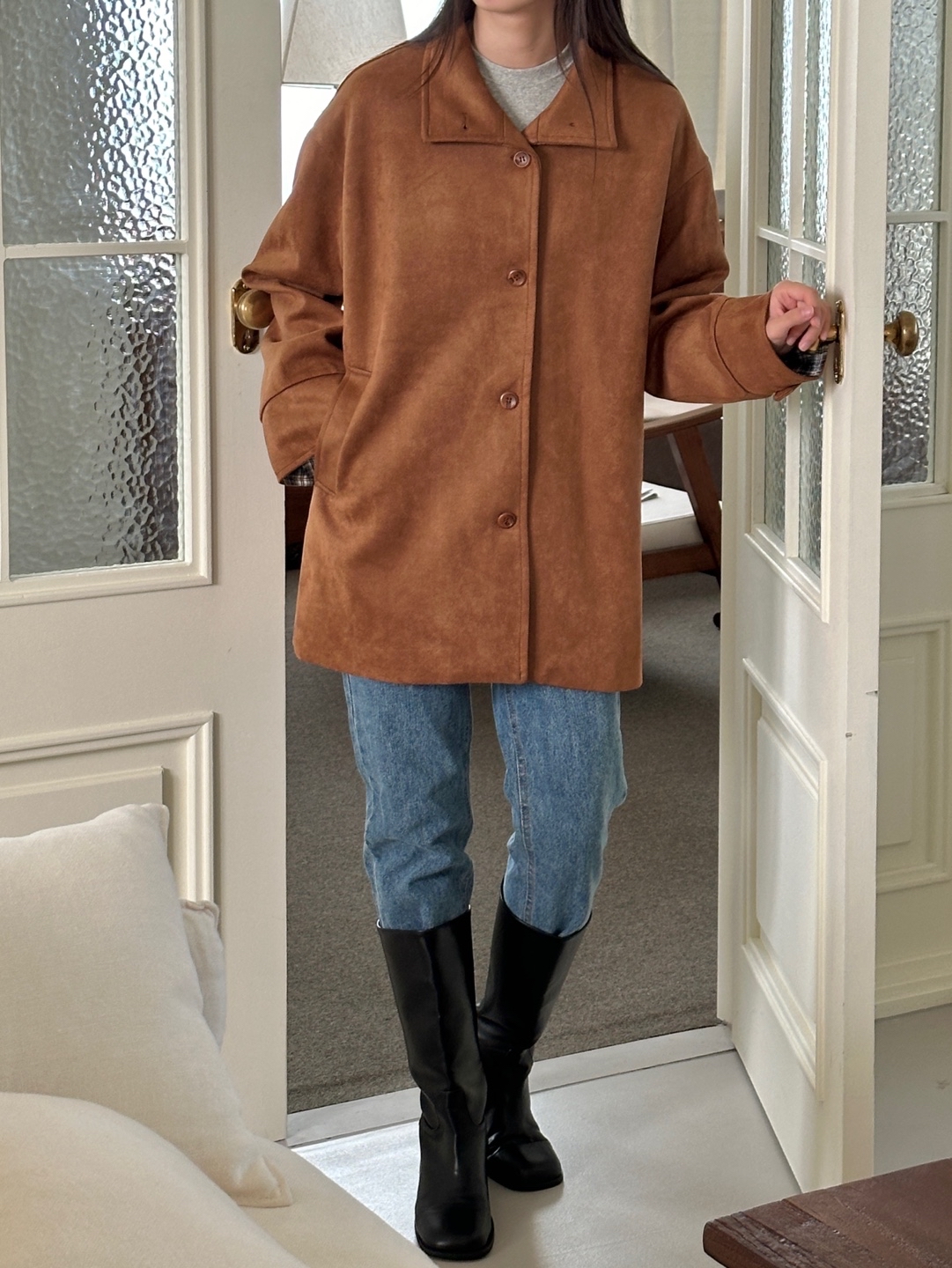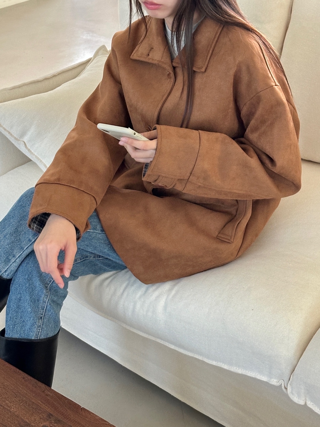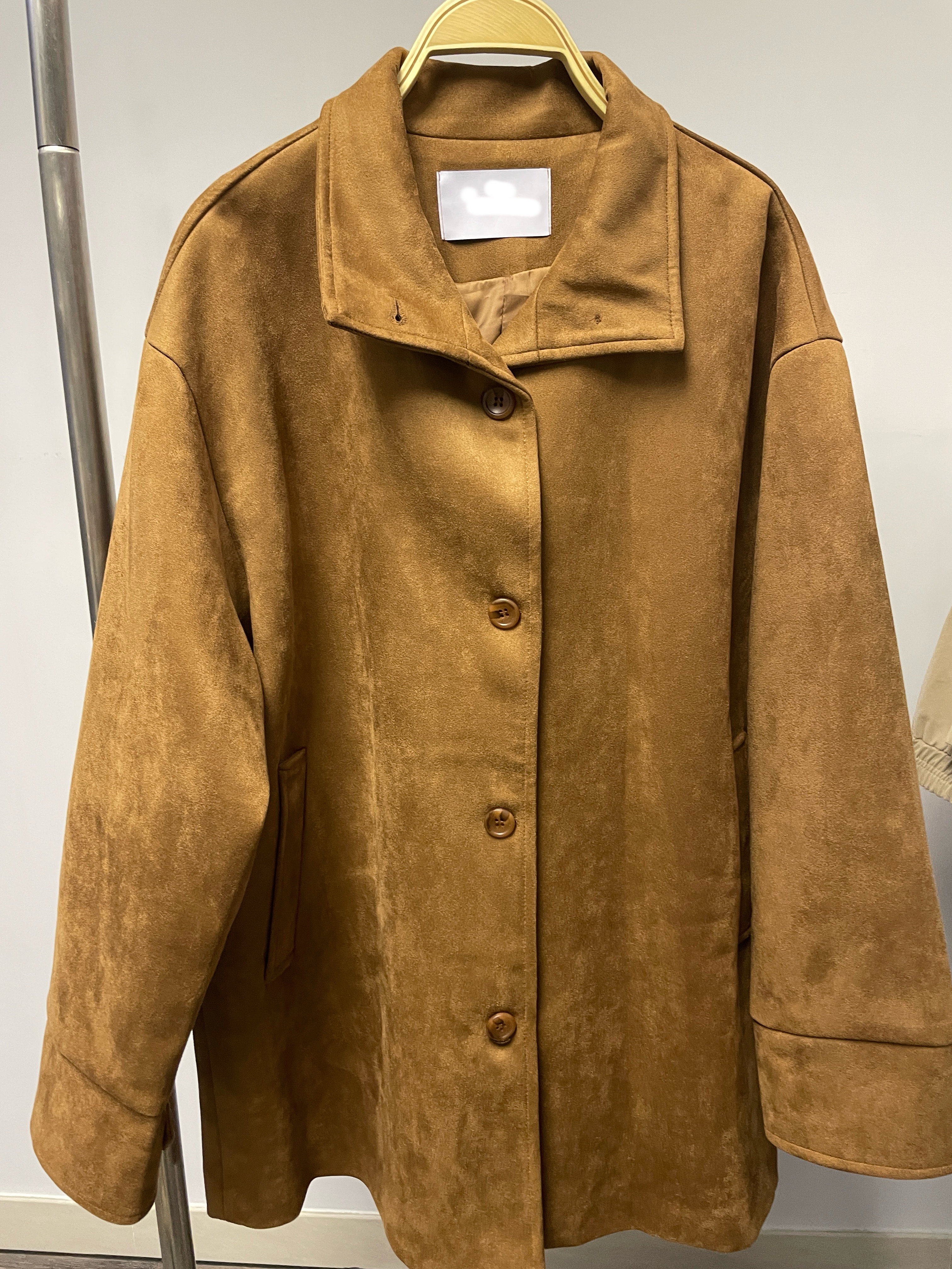 呢個仿麂皮料都幾像真,最重要係唔重身。 中長係今天秋冬好興的長度,蓋到pat pat位唔顯肥。 企領著更見硬朗。袖口反出來外露出格仔布,唔鐘意都可以唔反袖著。啡色比黑色會更突出麂皮質感。 📏尺寸:Free Size 胸圍: 48" 身長: 29.5"