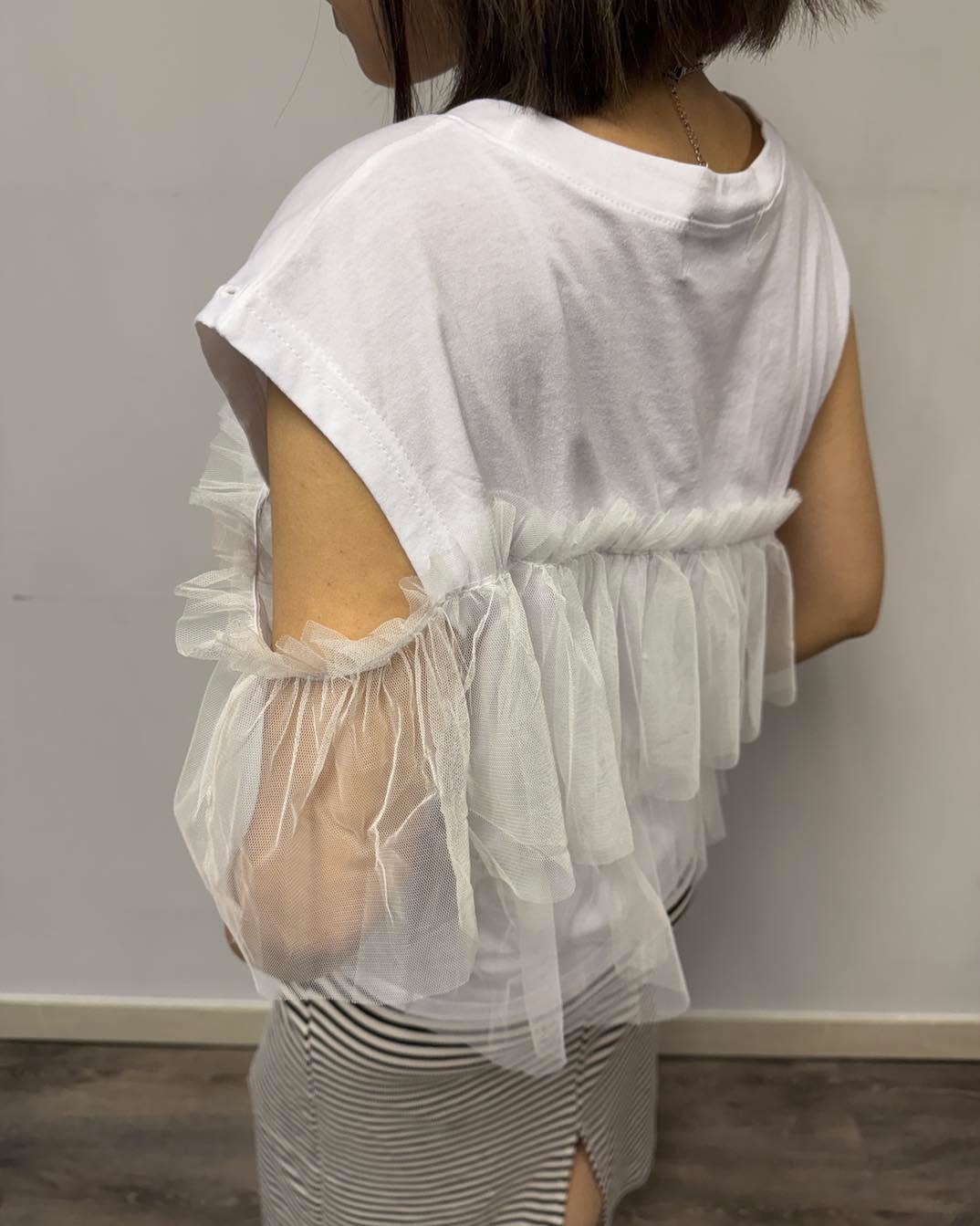 ▪️棉料大身配斜cut薄紗荷葉邊 ▪️左邊薄紗有三種穿法: * 可扣住薄紗,做出單邊袖效果 * 如果唔扣起, 薄紗可以垂在左手臂上 * 薄紗不穿過手臂, 大身ruffle 一幅過 📏尺寸:Free Size 胸圍: 36" 身長:21.5"