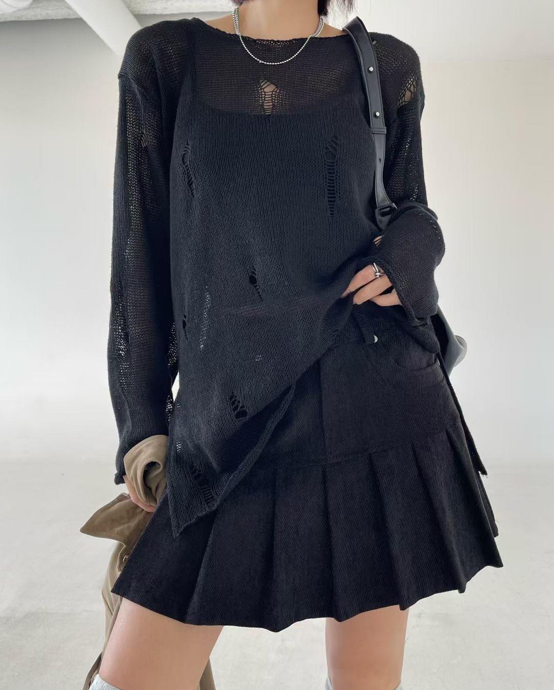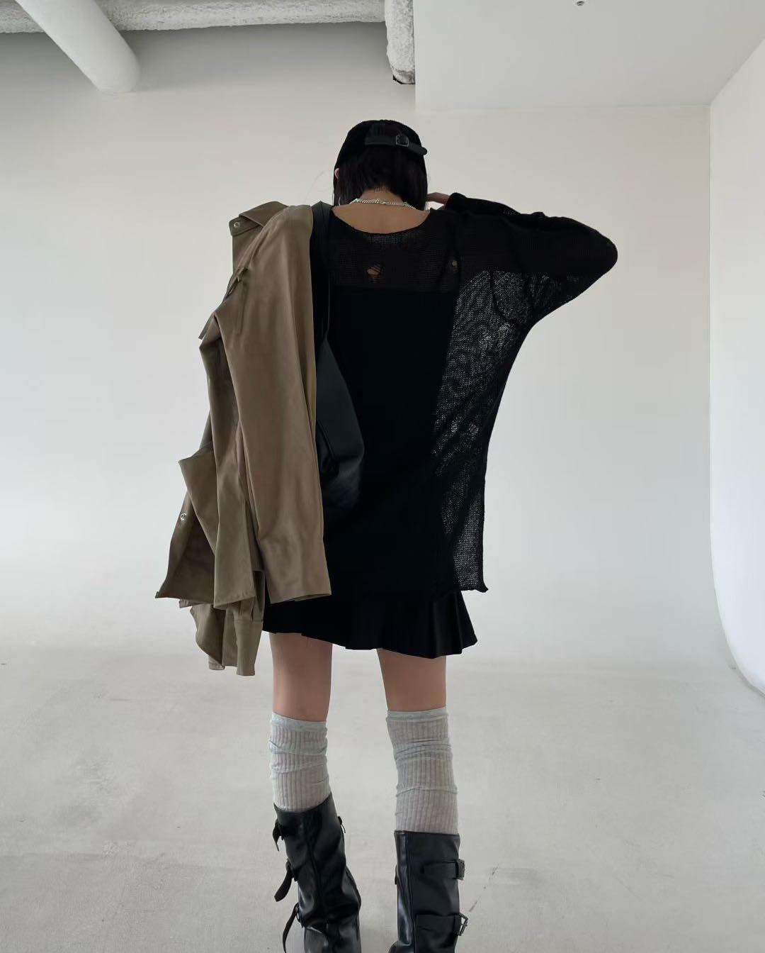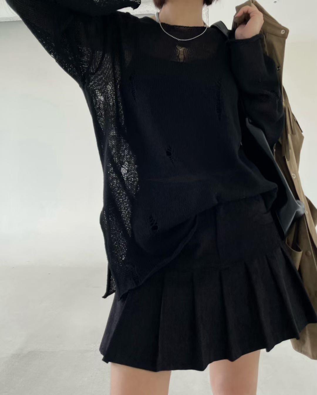 秋涼天氣著呢類形線仔衫最適合。 See through 破洞設計。 兩邊有側叉。 📏尺寸:Free Size 胸圍: 44" 身長: 28.5"