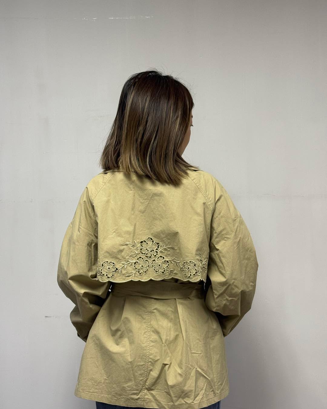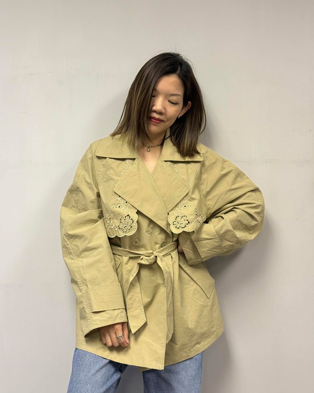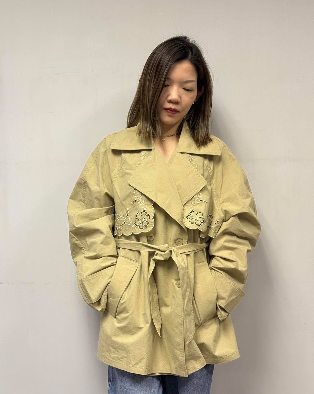 trench coat 乾濕褸會被視為長青而又不過時的款式。尤其卡其色, 夠哂經典! 完全適合而家乍暖還寒, 勿冷勿熱的天氣。 中短長度, 細粒身型都好fit身。 上身綉花好girly👯♀️ 📏尺寸:Free Size 胸圍: 52" 身長: 28.5"