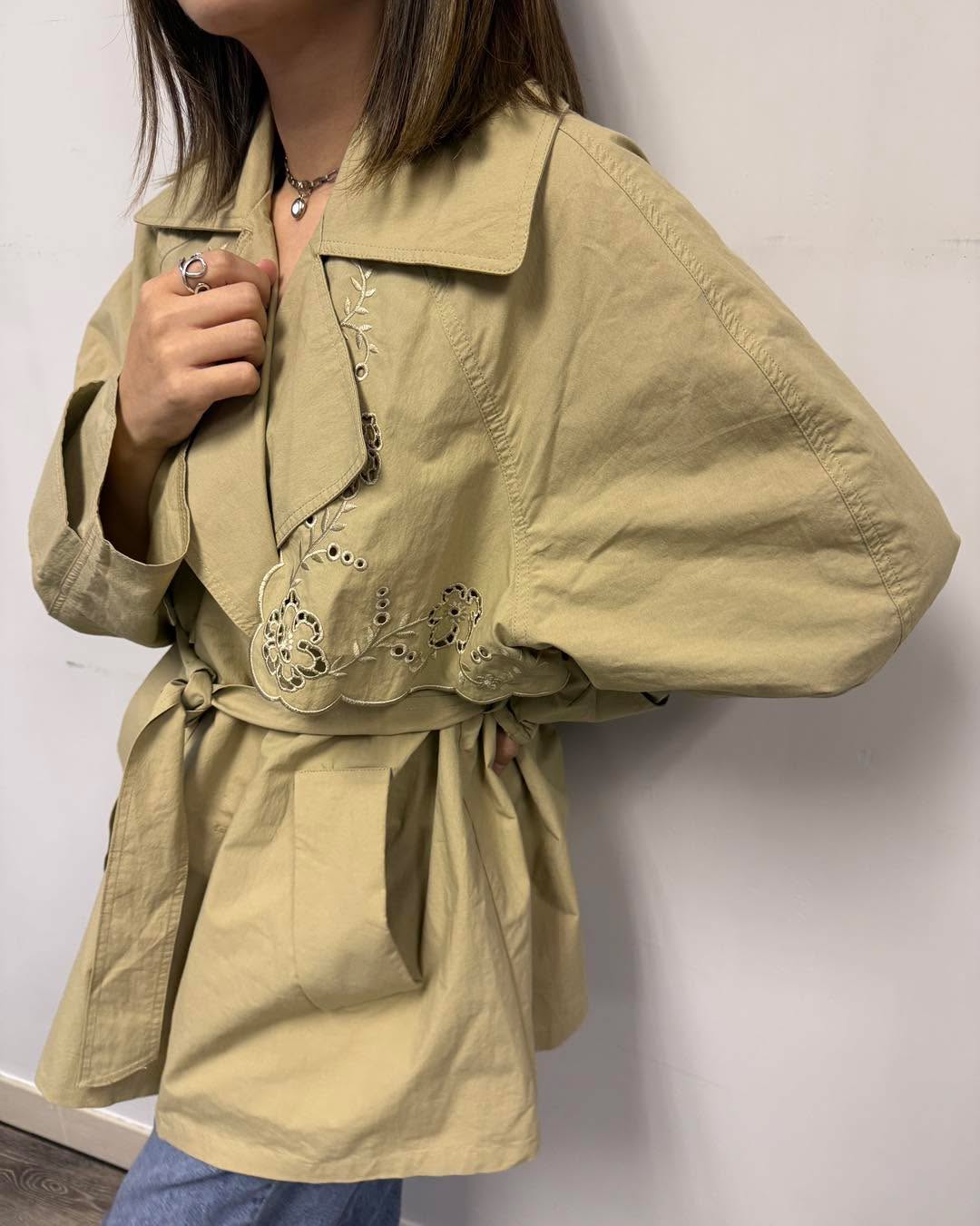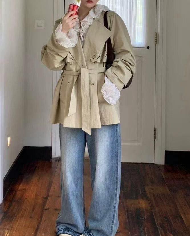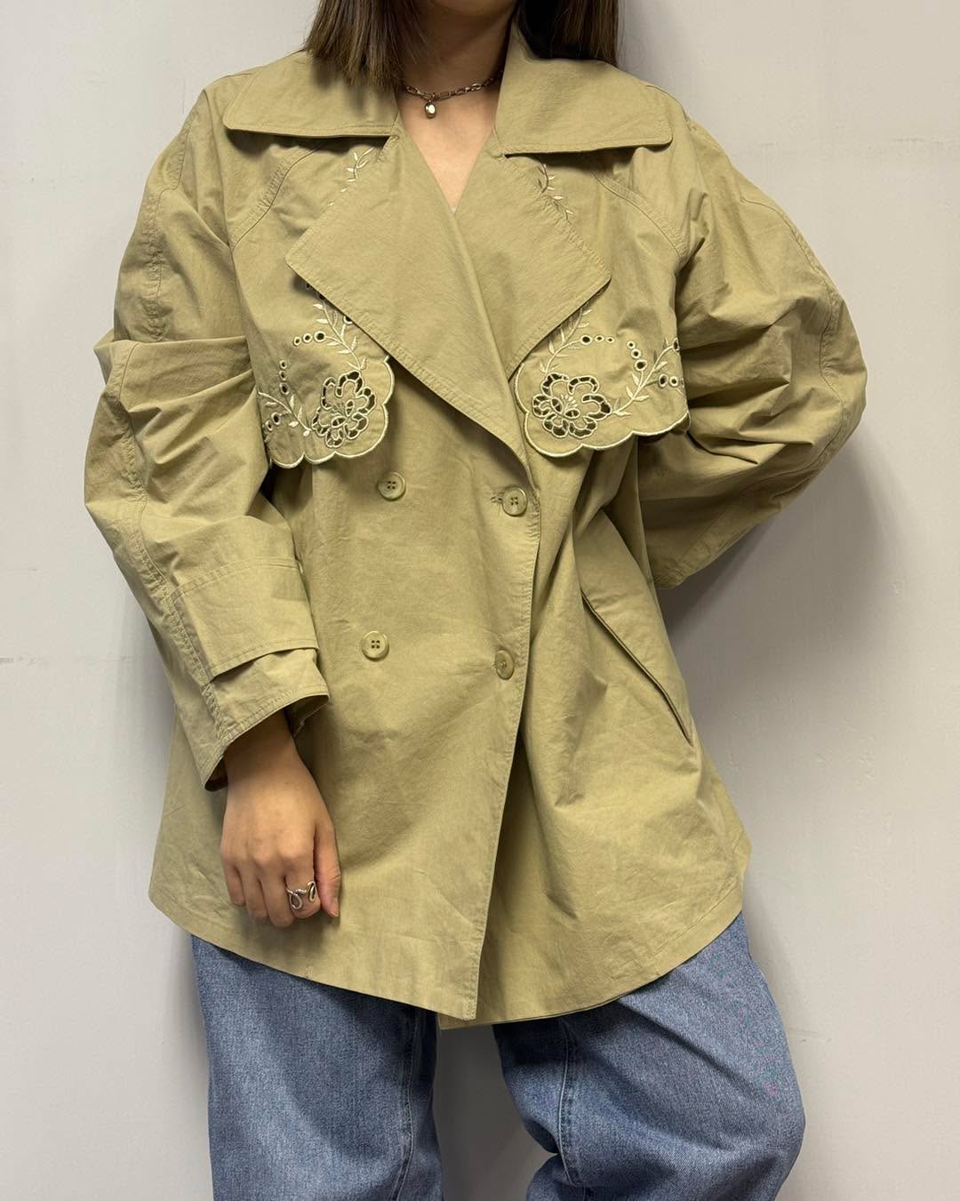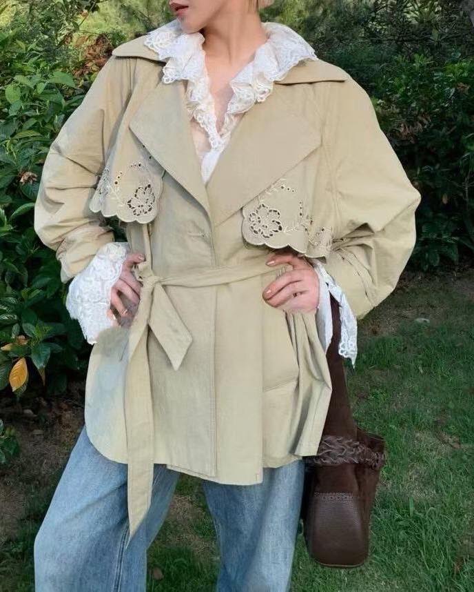 trench coat 乾濕褸會被視為長青而又不過時的款式。尤其卡其色, 夠哂經典! 完全適合而家乍暖還寒, 勿冷勿熱的天氣。 中短長度, 細粒身型都好fit身。 上身綉花好girly👯♀️ 📏尺寸:Free Size 胸圍: 52" 身長: 28.5"
