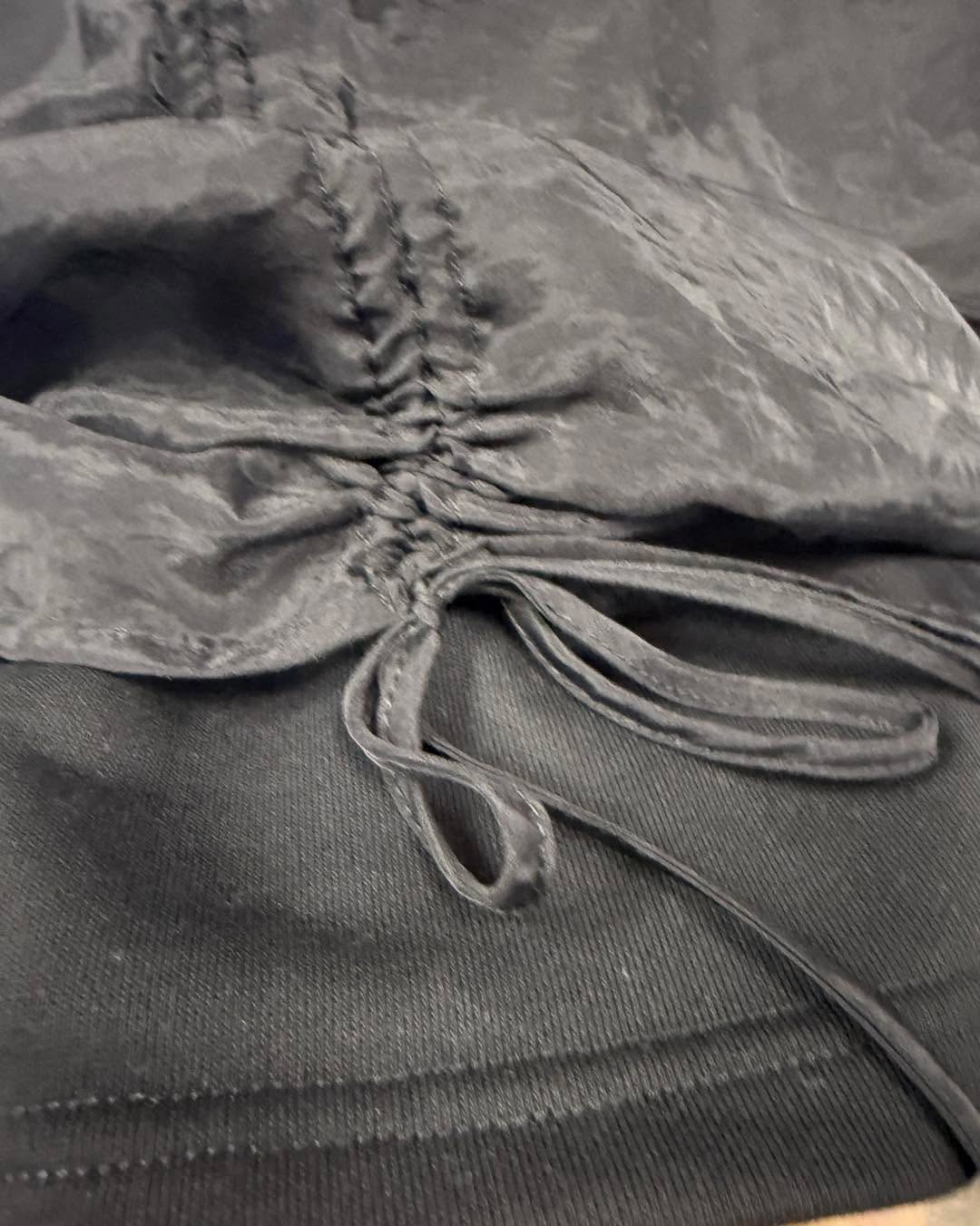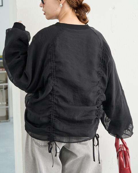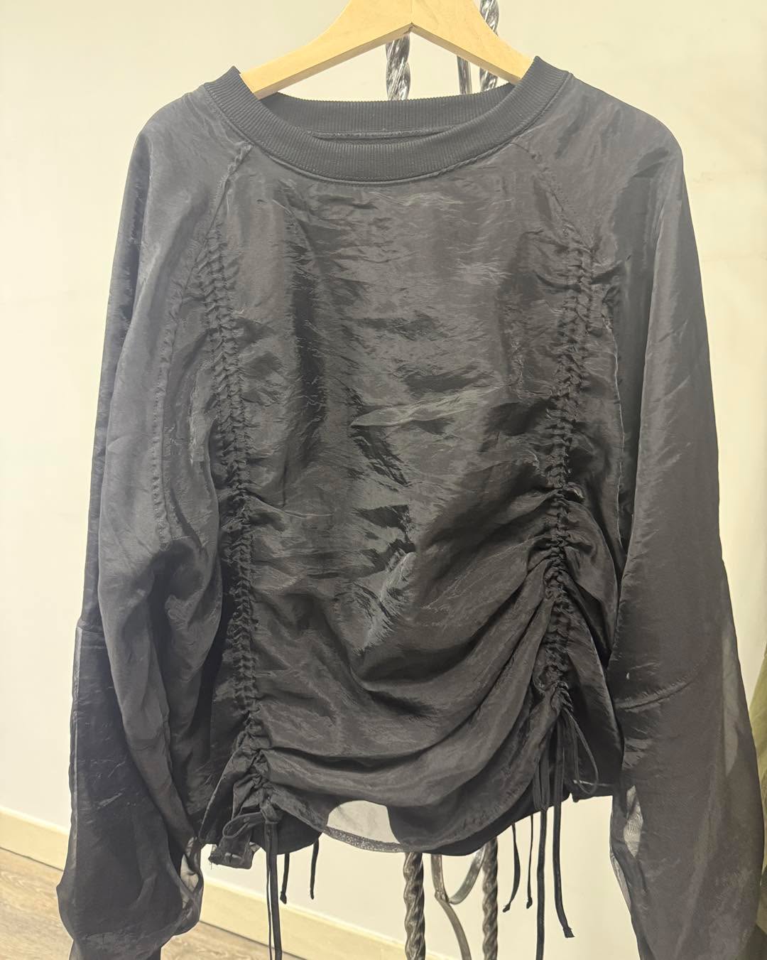 一件普通黑色衛衣全件覆蓋一層薄紗, 好典型的🎌設計造型, 前後幅薄紗都加上兩行束帶, 隨意束起反而更突出薄紗的光面感,黑色更subtle! 📏尺寸:Free Size 胸圍: 41" 身長: 23"