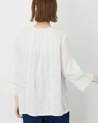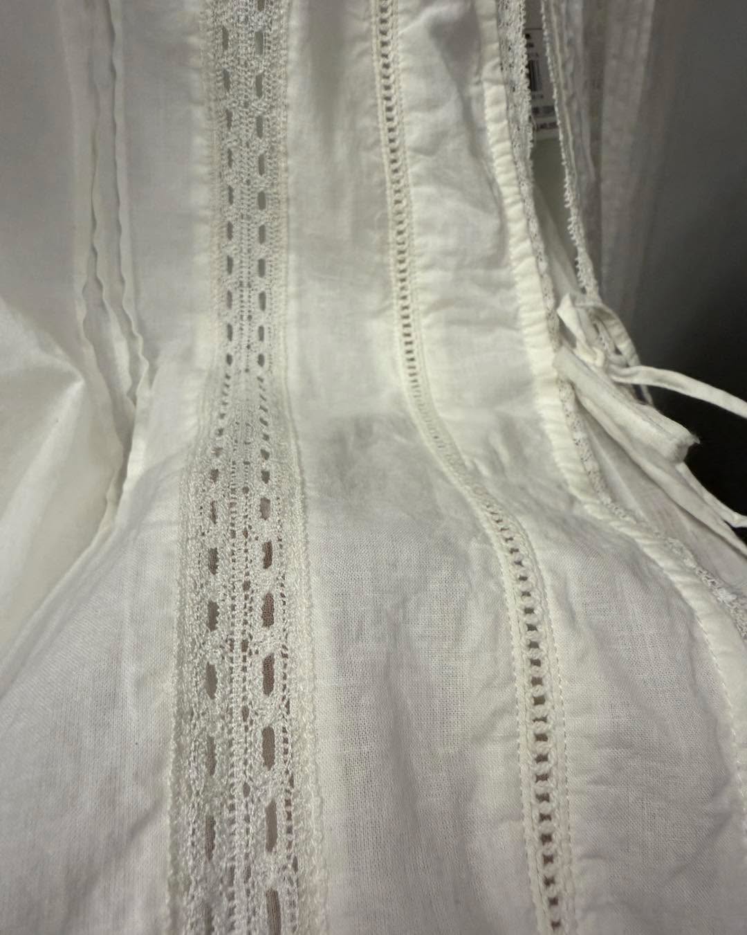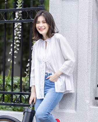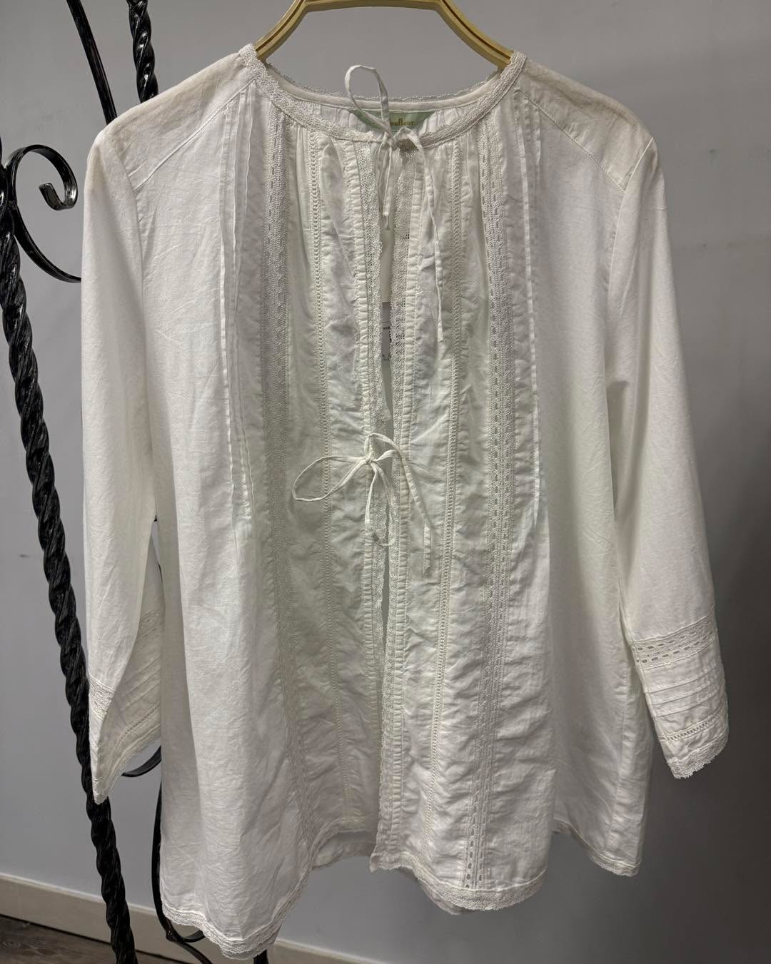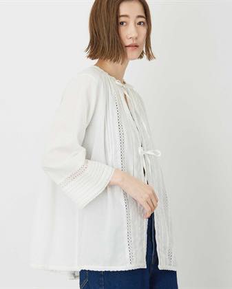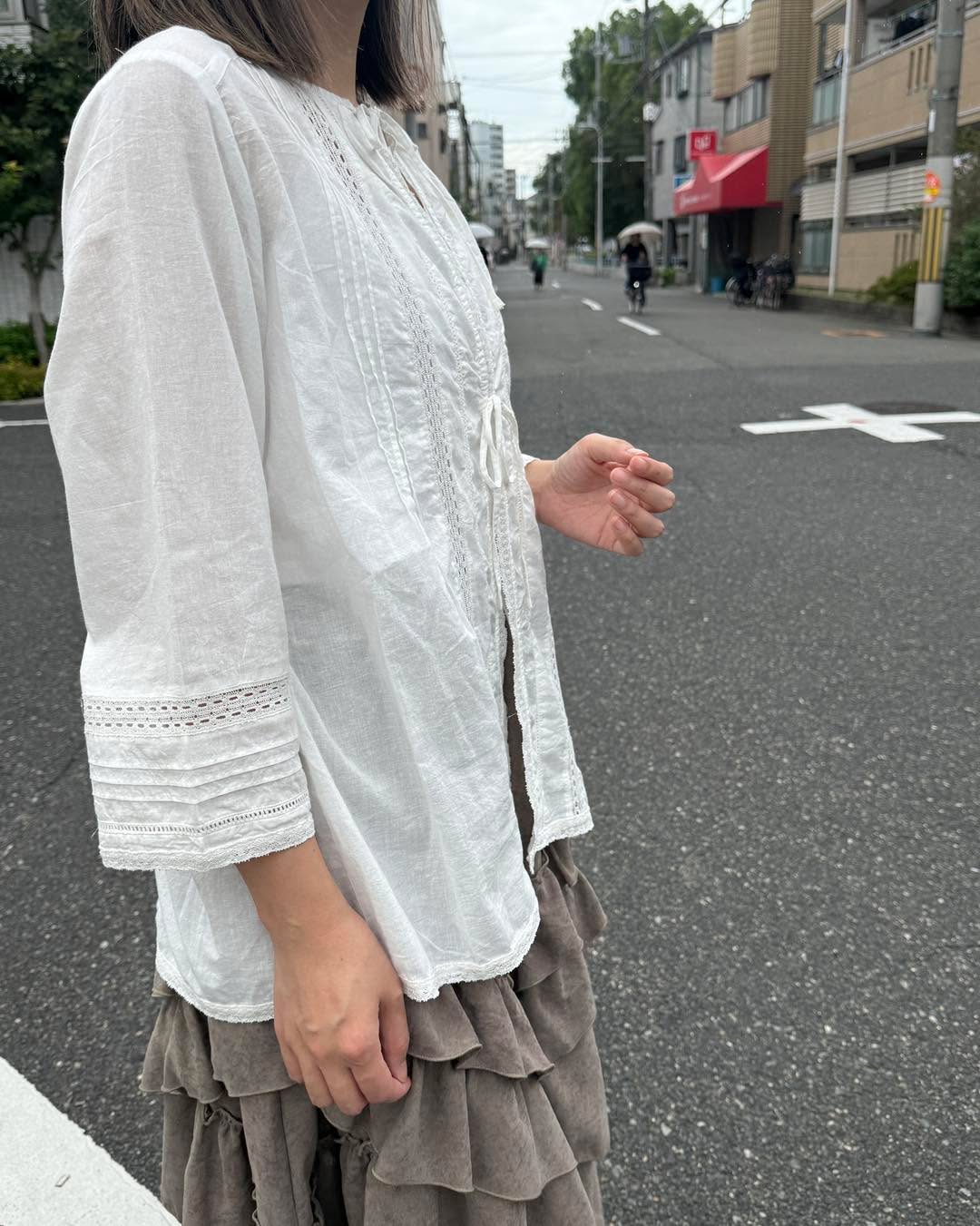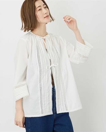 典型日系女裝棉料lace恤衫, 簡單襯裙襯褲都靚。前幅胸口位綁帶, 比起一般扣鈕款簡潔特別。 大身和袖口幾行褸空lace帶好細緻。 中袖設計適合秋涼🍂天氣。 📏尺寸:Free Size 胸圍: 45" 身長: 26"